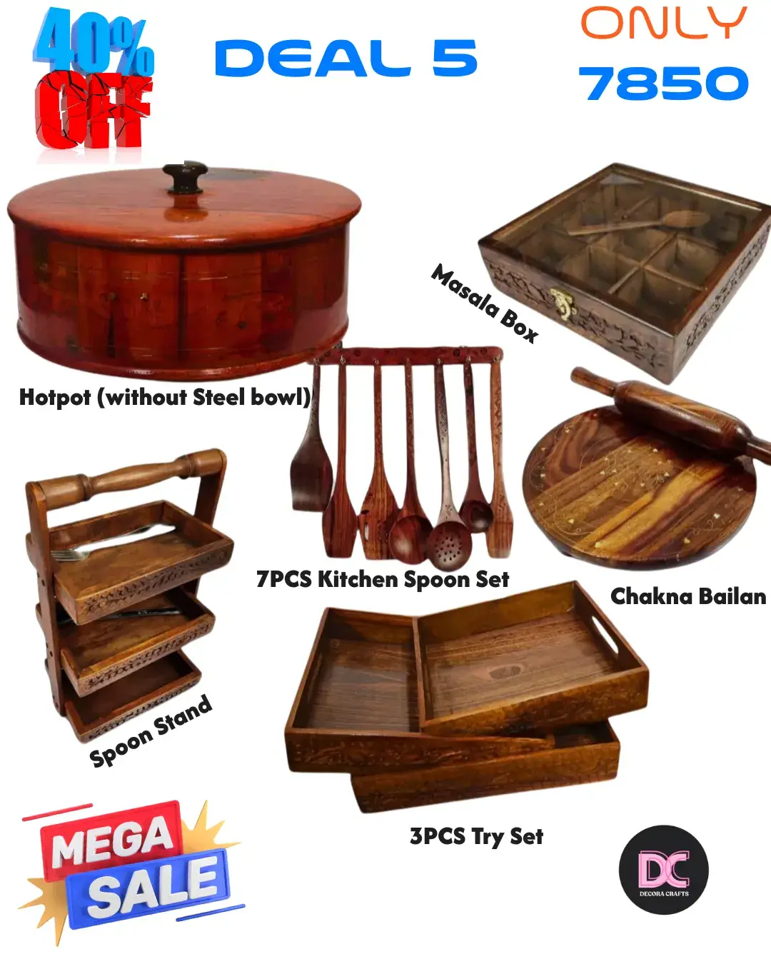 Upgrade your kitchen with the Handcrafted Wooden Kitchen Deal Set by Decora Crafts — a perfect combination of style, durability, and eco-friendly design. Crafted from premium Sheesham wood, this complete kitchen set brings natural elegance and functionality to your daily cooking experience.